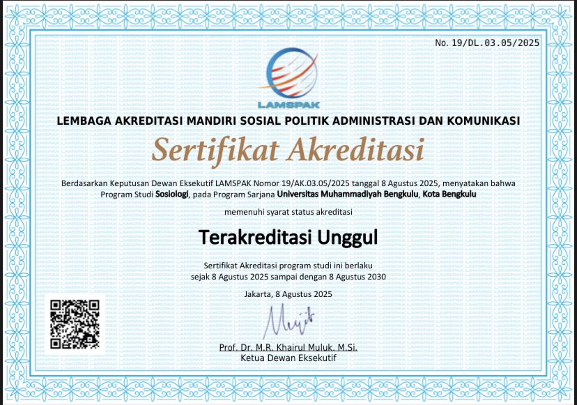 Bengkulu – Program Studi Sosiologi, Fakultas Ilmu Sosial dan Ilmu Politik, Universitas Muhammadiyah Bengkulu (UMB) kembali menorehkan prestasi membanggakan. Berdasarkan Keputusan Dewan Eksekutif LAMSPAK Nomor 19/AK.03.05/2025 tanggal 8 Agustus 2025, Prodi Sosiologi resmi meraih Akreditasi Unggul, peringkat akreditasi tertinggi yang diberikan kepada program studi di Indonesia.