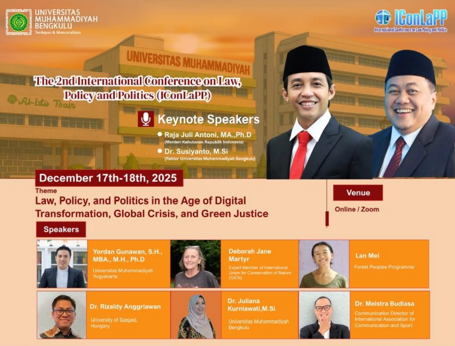 Universitas Muhammadiyah Bengkulu akan mengadakan The 2nd International Conference on Law, Policy, and Politics (IConLaPP) 2025 pada 17–18 Desember 2025…